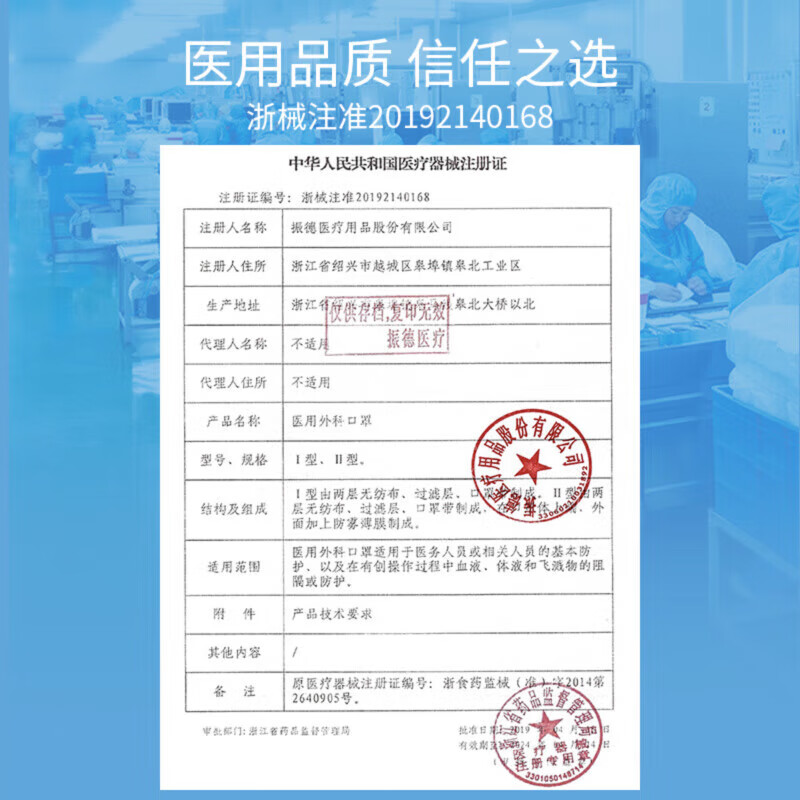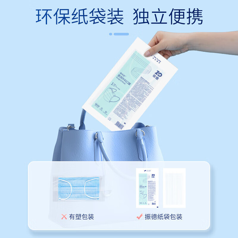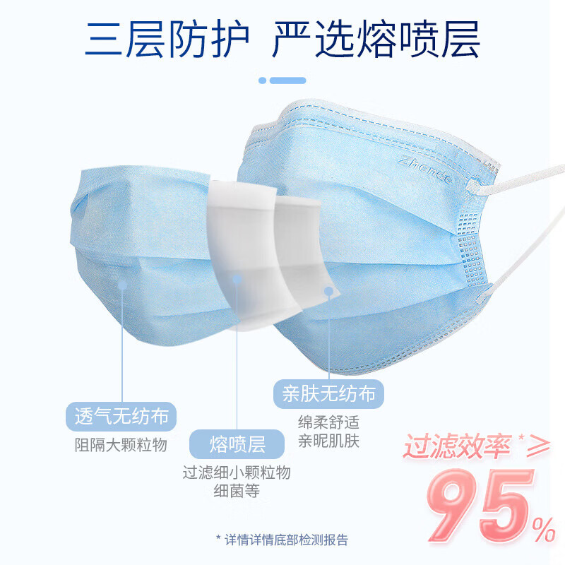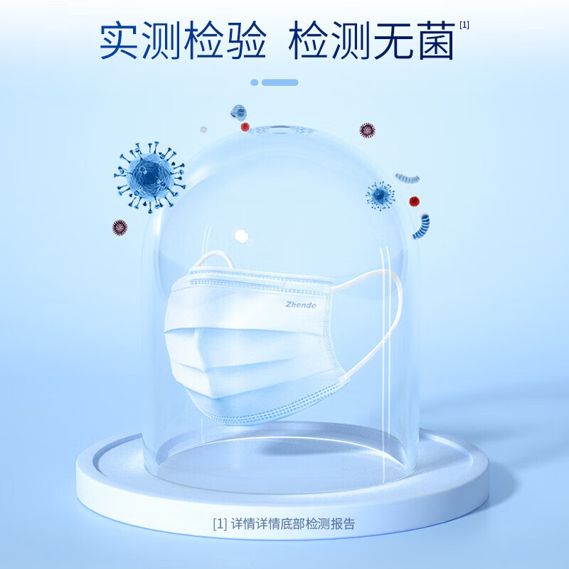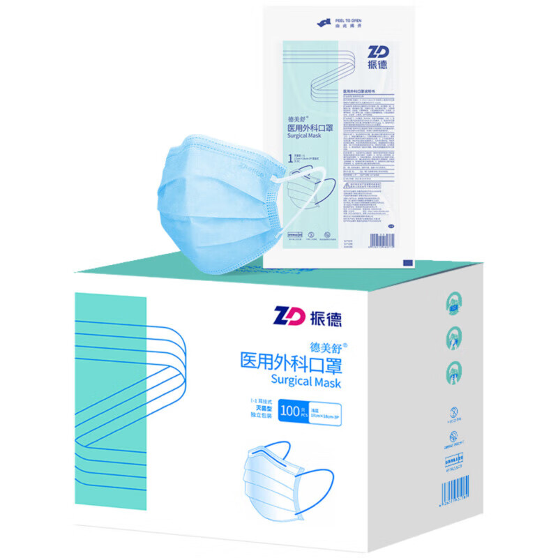 商品名称:振德(ZHENDE)一次性医用外科口罩 灭菌独立浅蓝100只/盒 无菌级细菌过滤效率大于95%夏季防沙尘花粉