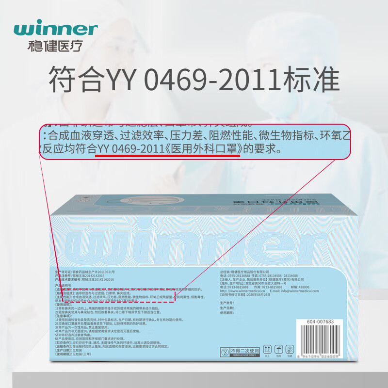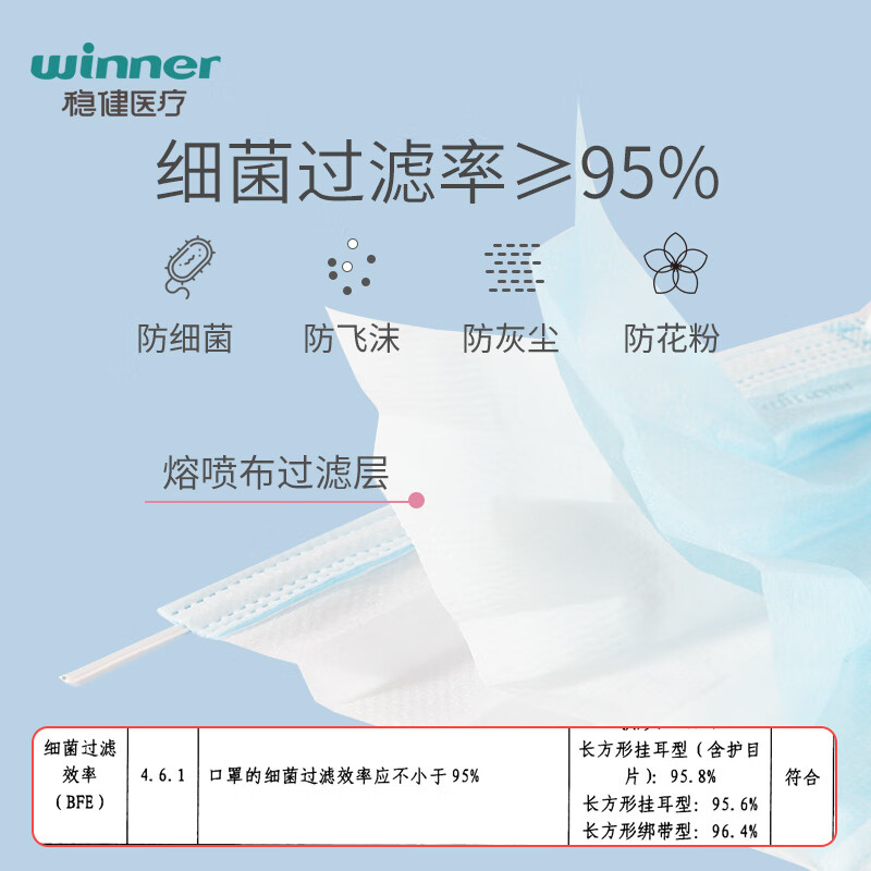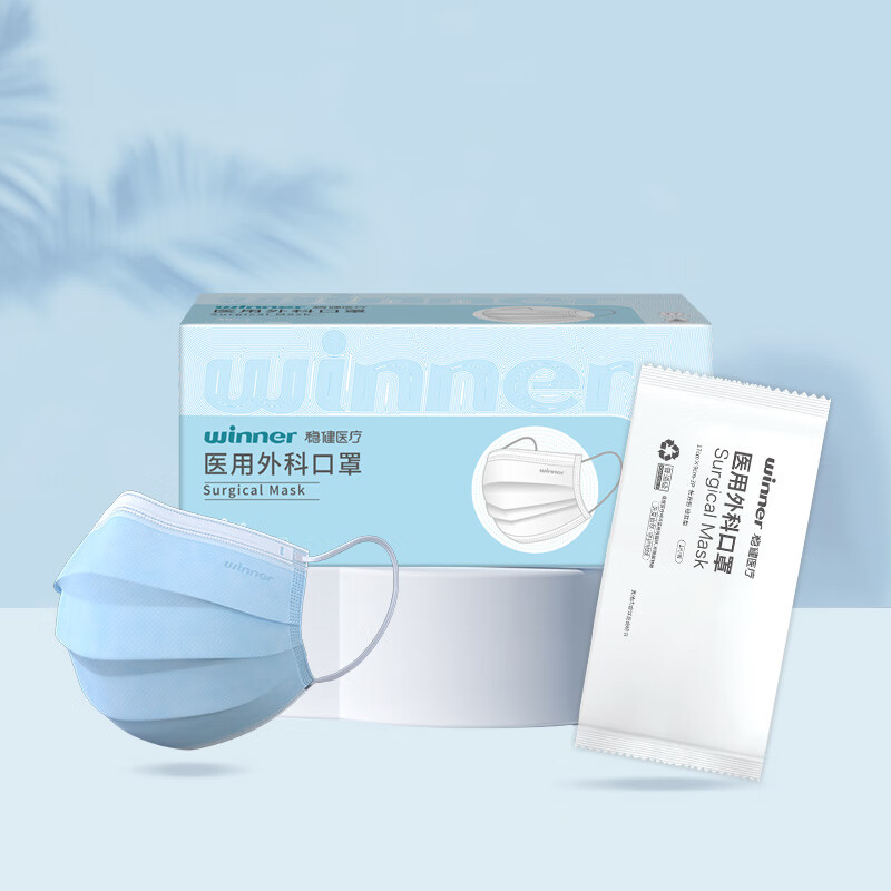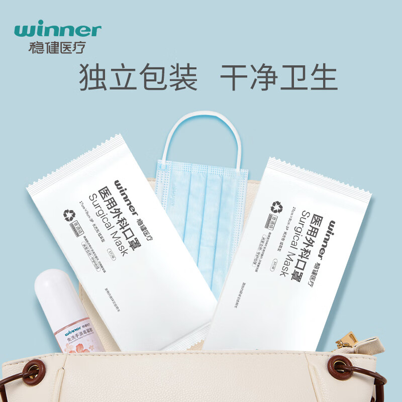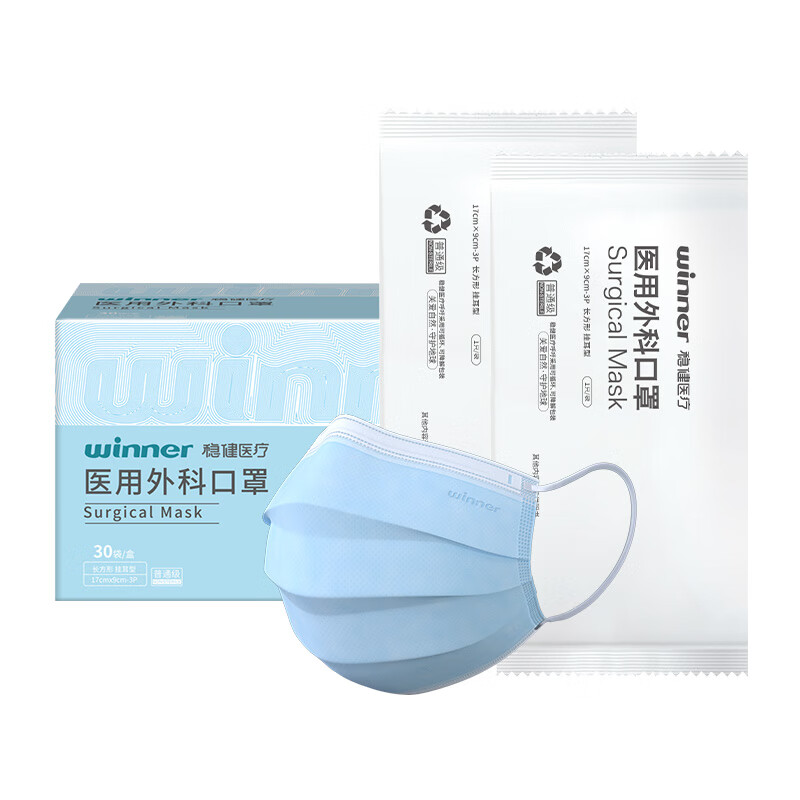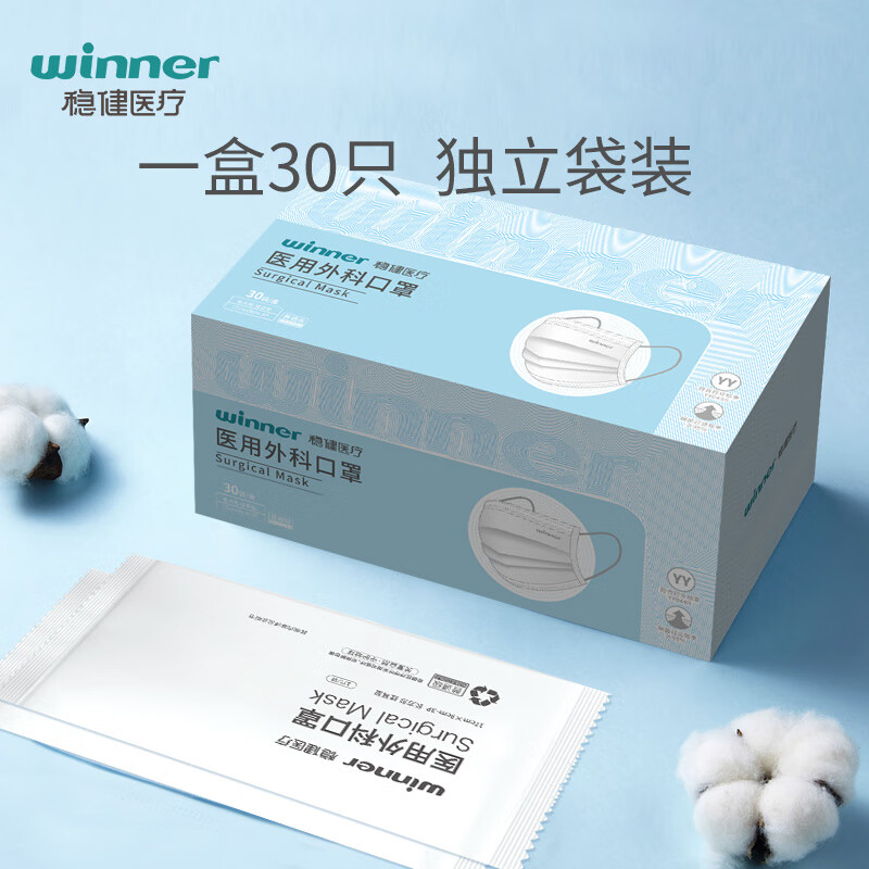 商品名称:稳健(Winner)医用外科口罩一次性口罩三层防护细菌过滤率大于95% 独立装30只/盒*3盒(90只)
