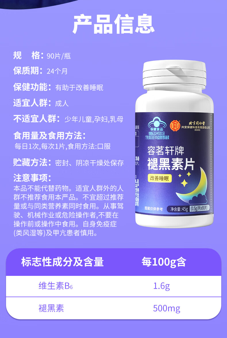 商品名称:褪黑素片90片 维生素b6改善睡眠成人男女中老年失眠退黑色素退黑素安眠助睡闪睡片 1瓶装