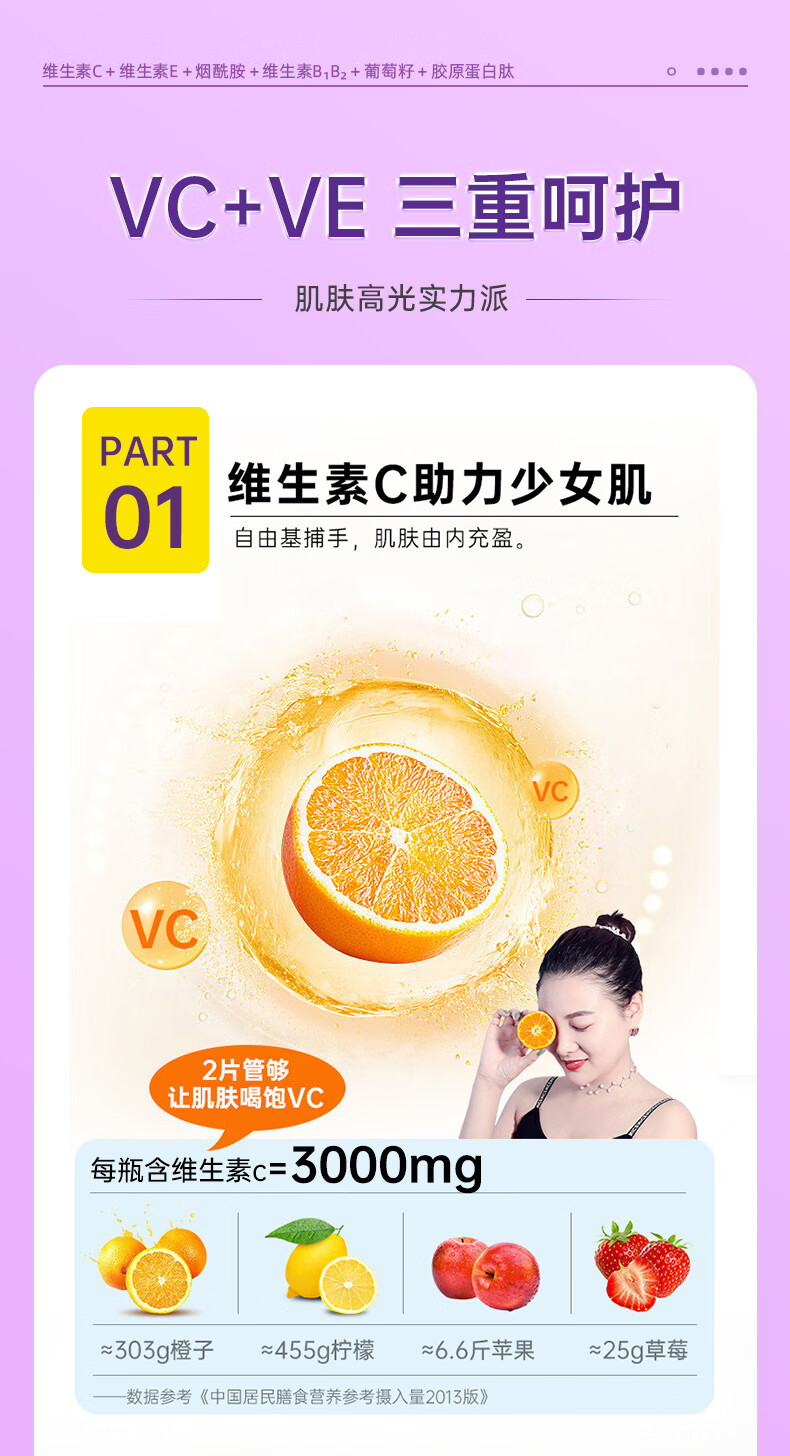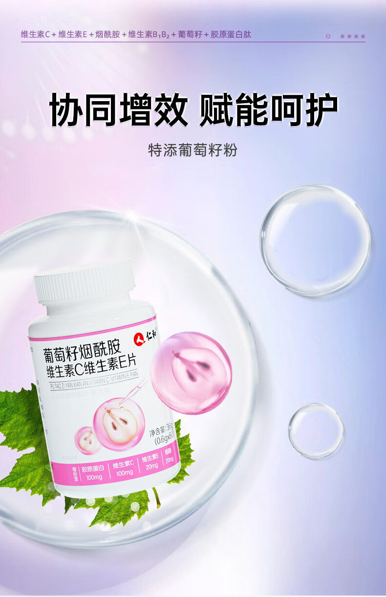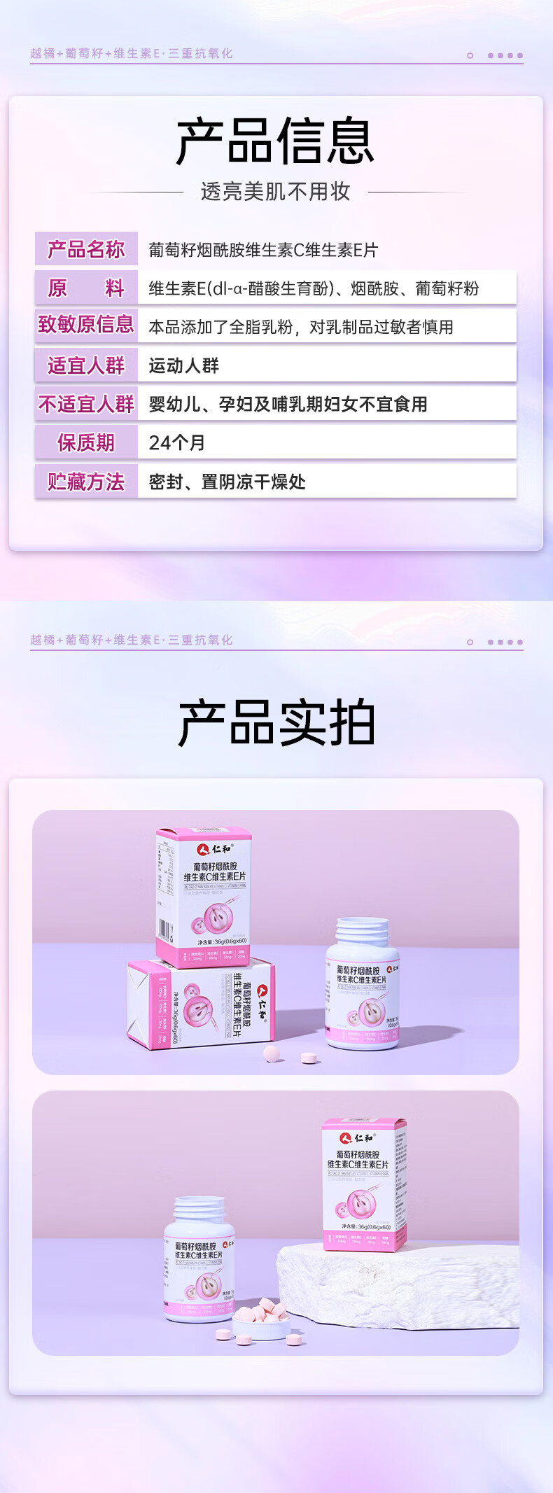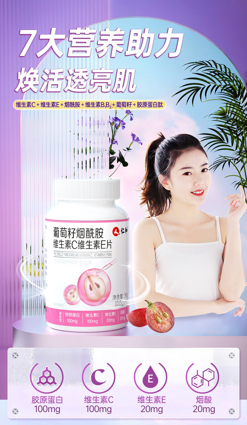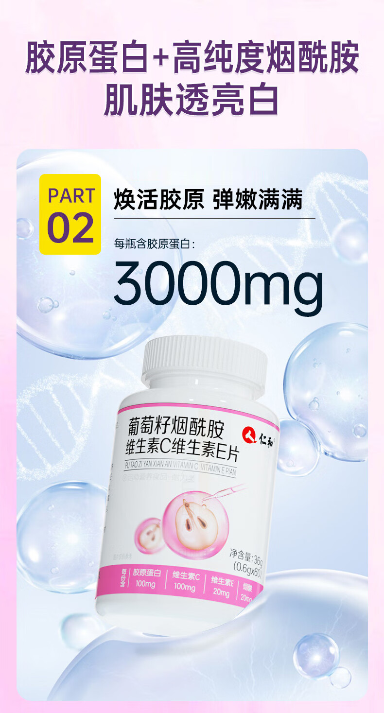 商品名称:仁和 维生素C维生素E烟酰胺 复合维生素VCVE烟酸 葡萄籽烟酰胺维生素C维生素E片 3瓶装