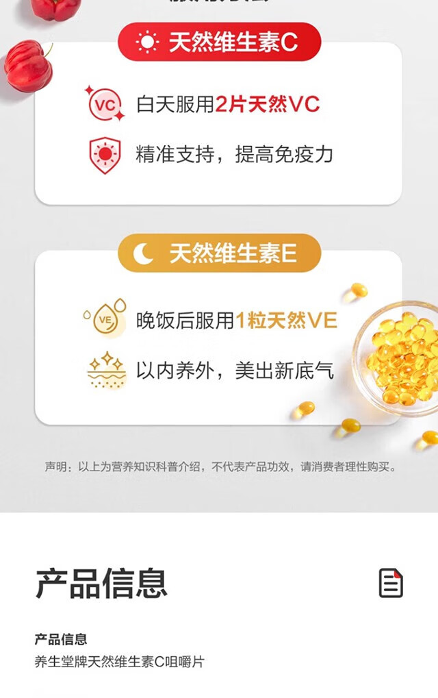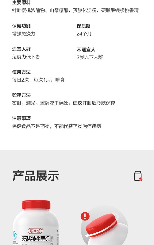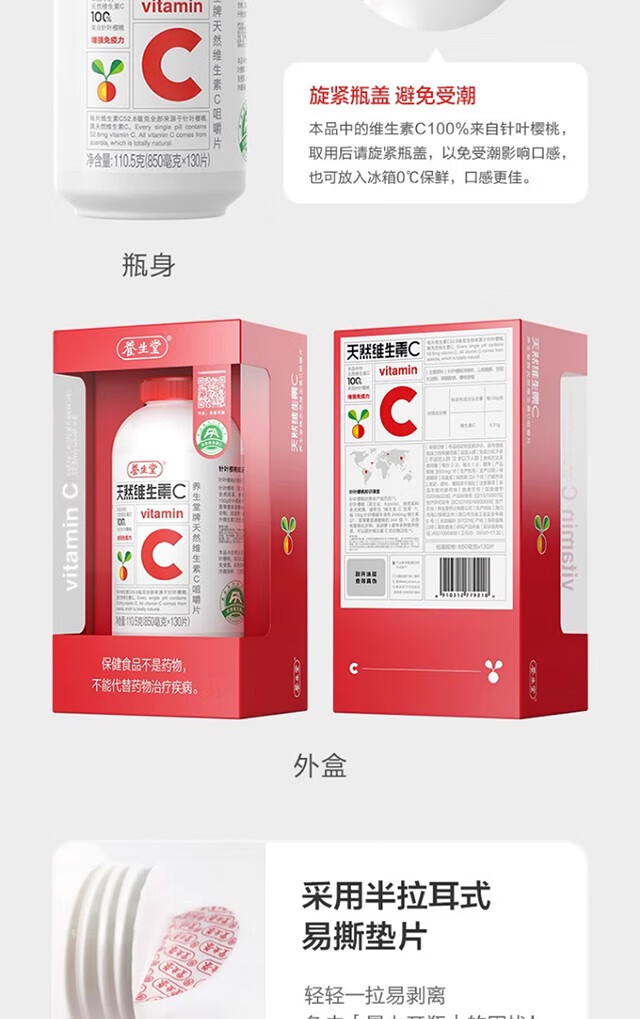 商品名称:养生堂天然维生素C增强免疫力VC片咀嚼片针叶樱桃维C片 130片/1盒装