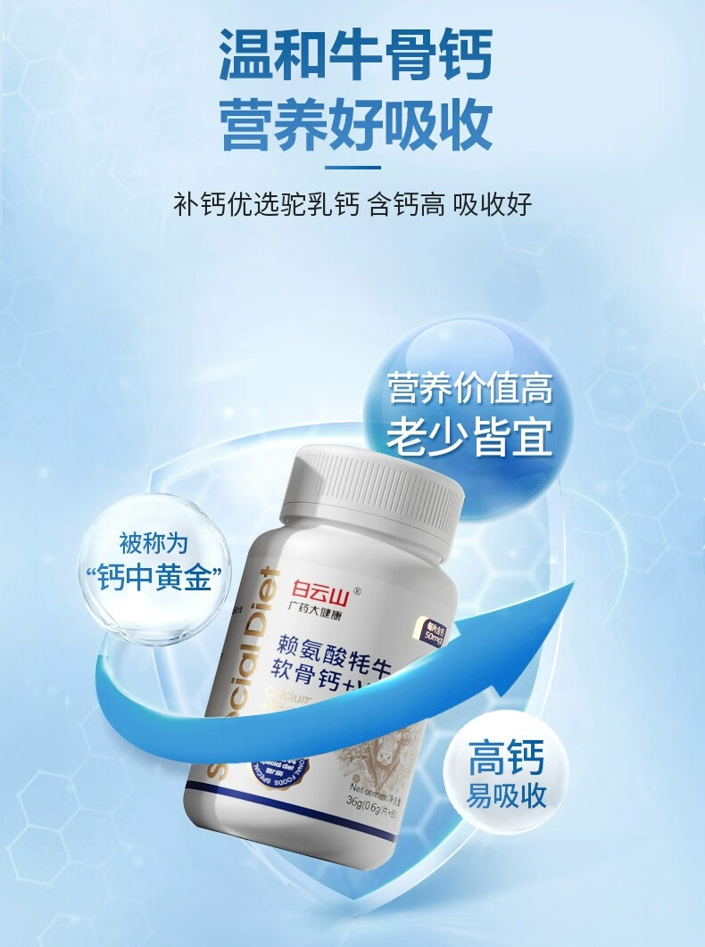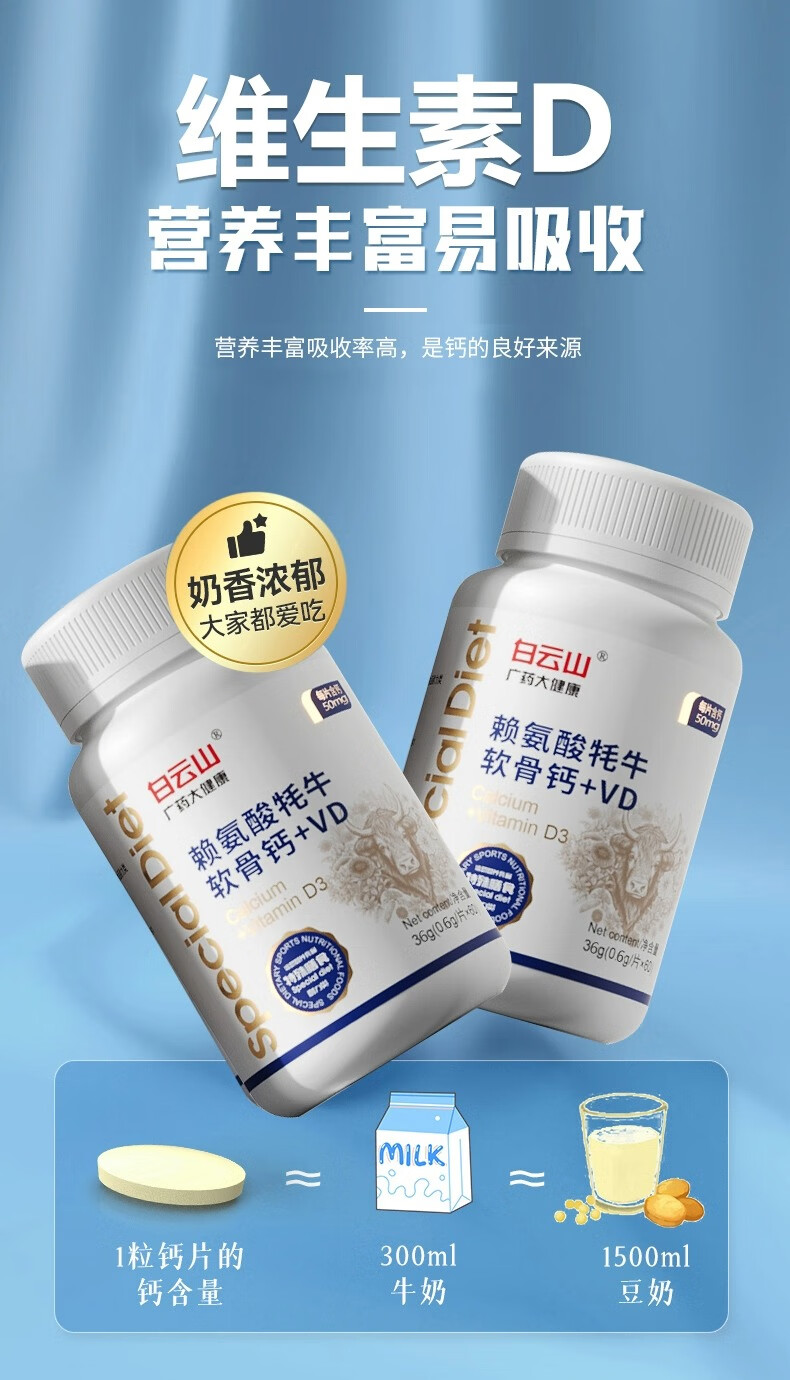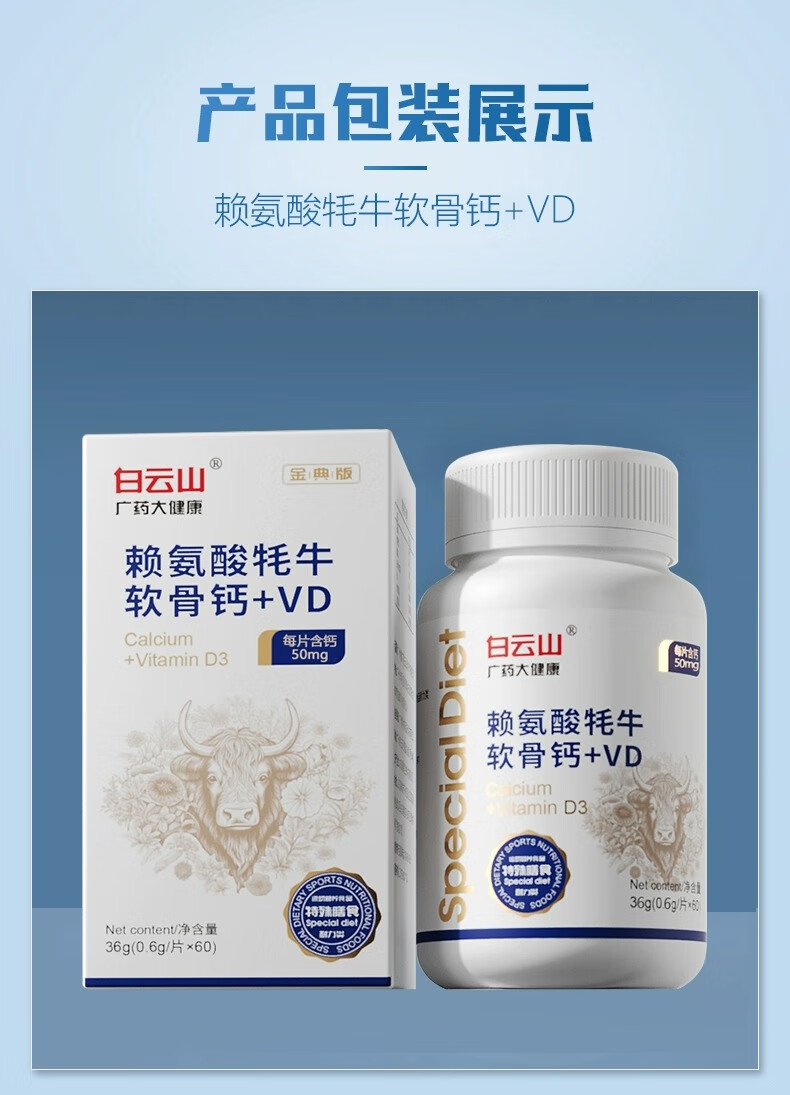 商品名称:白云山 赖氨酸牦牛软骨钙+VD钙片 成人儿童钙片6-13岁11岁维生素d 4-17岁 高钙青少年成长钙片中老年180粒