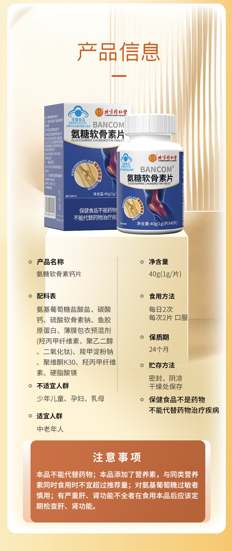 商品名称:北京同仁堂 内廷上用 氨糖软骨素钙片1盒40片保健品增加骨密度重塑关节健康补钙膝盖腰肩肘椎送父母送长辈