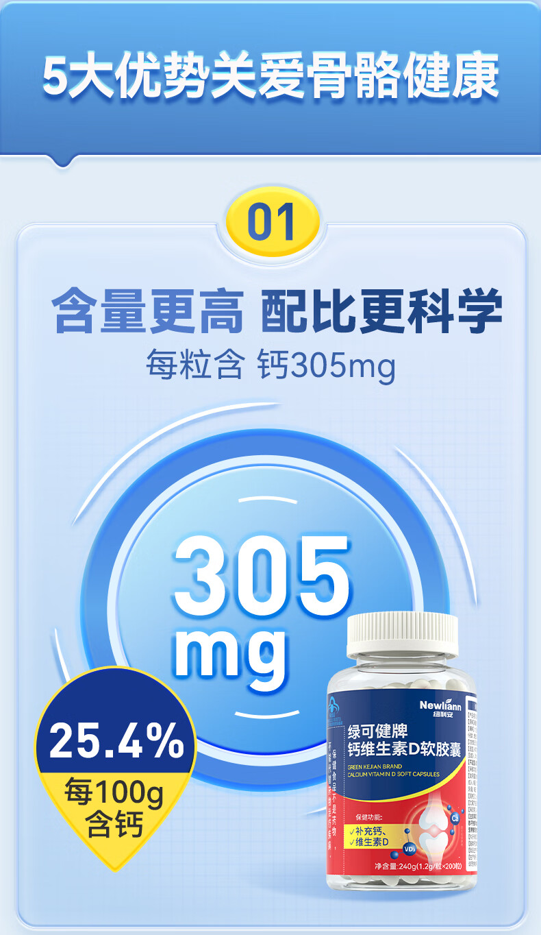 商品名称:纽利安Newliann钙片 钙d 维生素d 钙D软胶囊 成人中老年人液体钙片 补钙 1.2g/粒*200粒