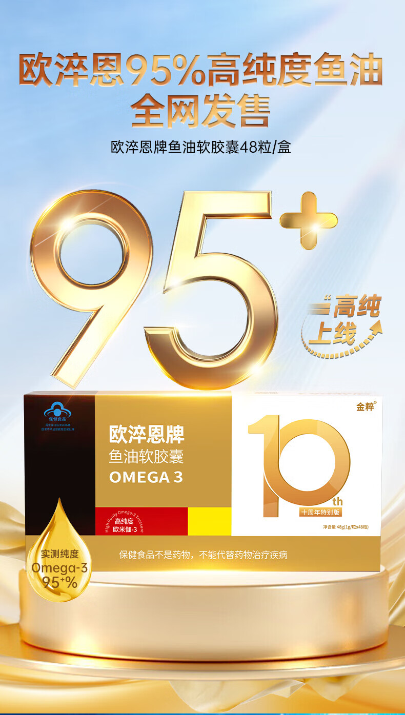 欧淬恩 高纯度鱼油深海鱼油软胶囊48粒 中老年保健品辅助降血脂omega-3 1盒【95%纯度】