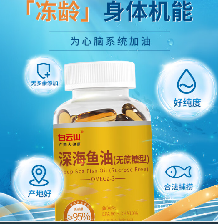 白云山 鱼油胶囊 无蔗糖型 【3瓶装】omega-3软胶囊 含dha+epa 鱼肝油 成人中老年人深海鱼油180粒